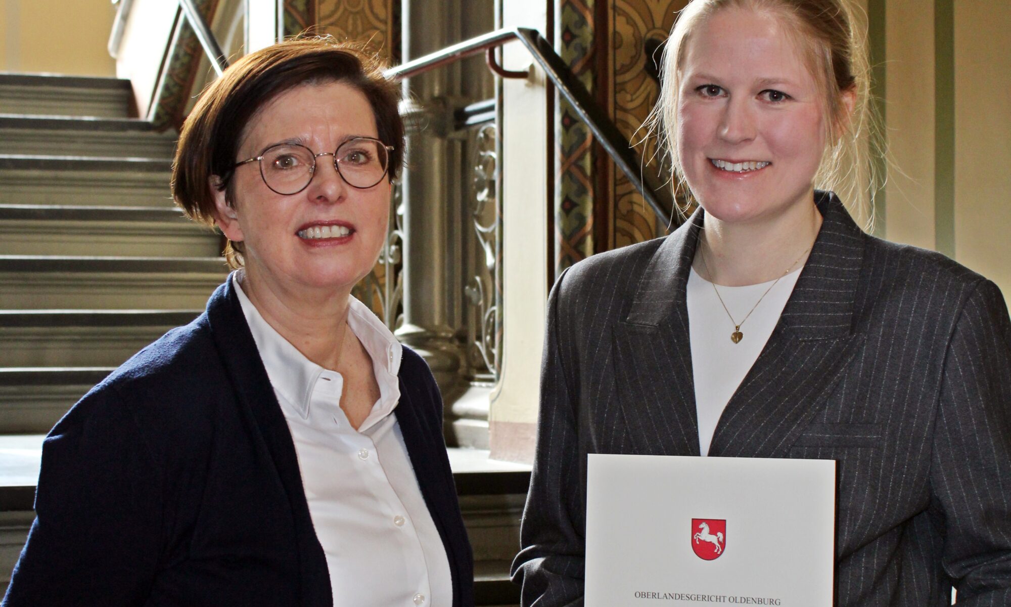 Die Vizepräsidentin des Osnabrücker Landgerichtes, Dr. Nicole Hellmich, hat Nele Krüssel aus Meppen gestern die Ernennungsurkunde zur Notarin überreicht. Nele Krüssel ist Rechtsanwältin in einer Meppener Kanzlei und wird künftig als Anwaltsnotarin tätig sein. Ihr Amtssitz ist am Kanzleistandort, ihr Zuständigkeitsbereich umfasst den Bezirk des Amtsgerichts Meppen. Notarinnen und Notare sind in Deutschland Träger eines öffentlichen Amtes. Sie beurkunden Rechtsgeschäfte, beraten unabhängig und sollen zur Rechtssicherheit sowie zur Vermeidung von Streitigkeiten beitragen. Im Bezirk des Oberlandesgerichts Oldenburg sind derzeit rund 420 Notarinnen und Notare tätig.