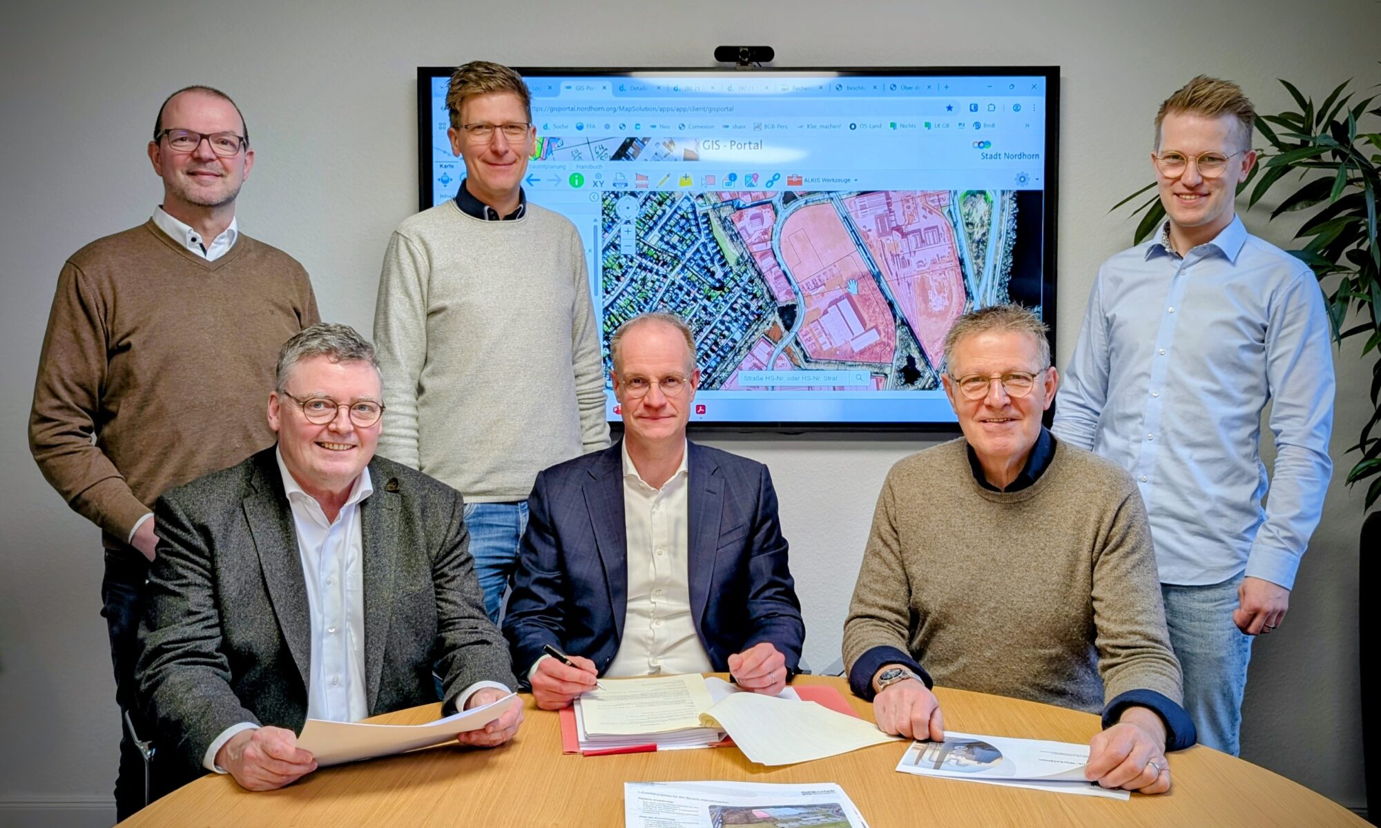 Foto (c) Stadt Nordhorn: (vorne von links) Bürgermeister Thomas Berling, Notar Dr. Jörg Grundmann und Werkstätten-Geschäftsführer Alfred Moggert sowie (hinten von links) Wirtschaftsförderer Karsten Müller und die beiden Rosink-Werkstätten-Geschäftsführer Sven Moggert und Janek Moggert.
