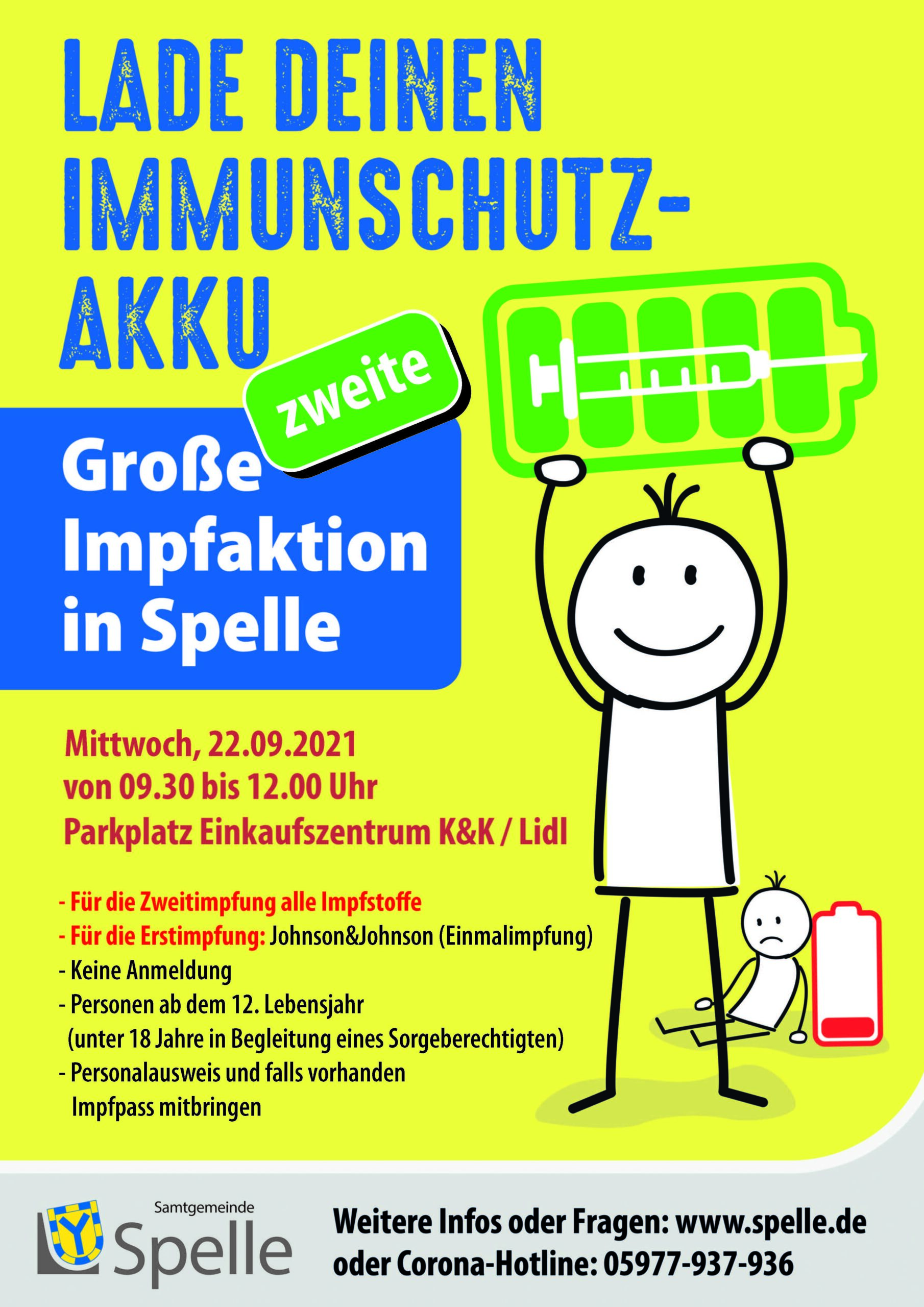 Die Gemeinde Spelle bietet am Mittwoch eine Impfaktion auf dem Parkplatz der Supermärkte K+K und Lidl an der Ringstraße an. Die Aktion beginnt um 9.30 Uhr und geht bis 12 Uhr. Wer noch keine Corona-Impfung erhalten hat, kann sich laut einer Mitteilung der Samtgemeinde vor Ort ohne großen Aufwand impfen lassen. Bei Erstimpfungen wird der Impfstoff von Johnson & Johnson verabreicht, mit dem nur eine Impfung für den vollen Impfschutz notwendig ist. Für eine Zweitimpfung stehen am Mittwoch alle Impfstoffe zur Verfügung. Eine Anmeldung ist nicht erforderlich.