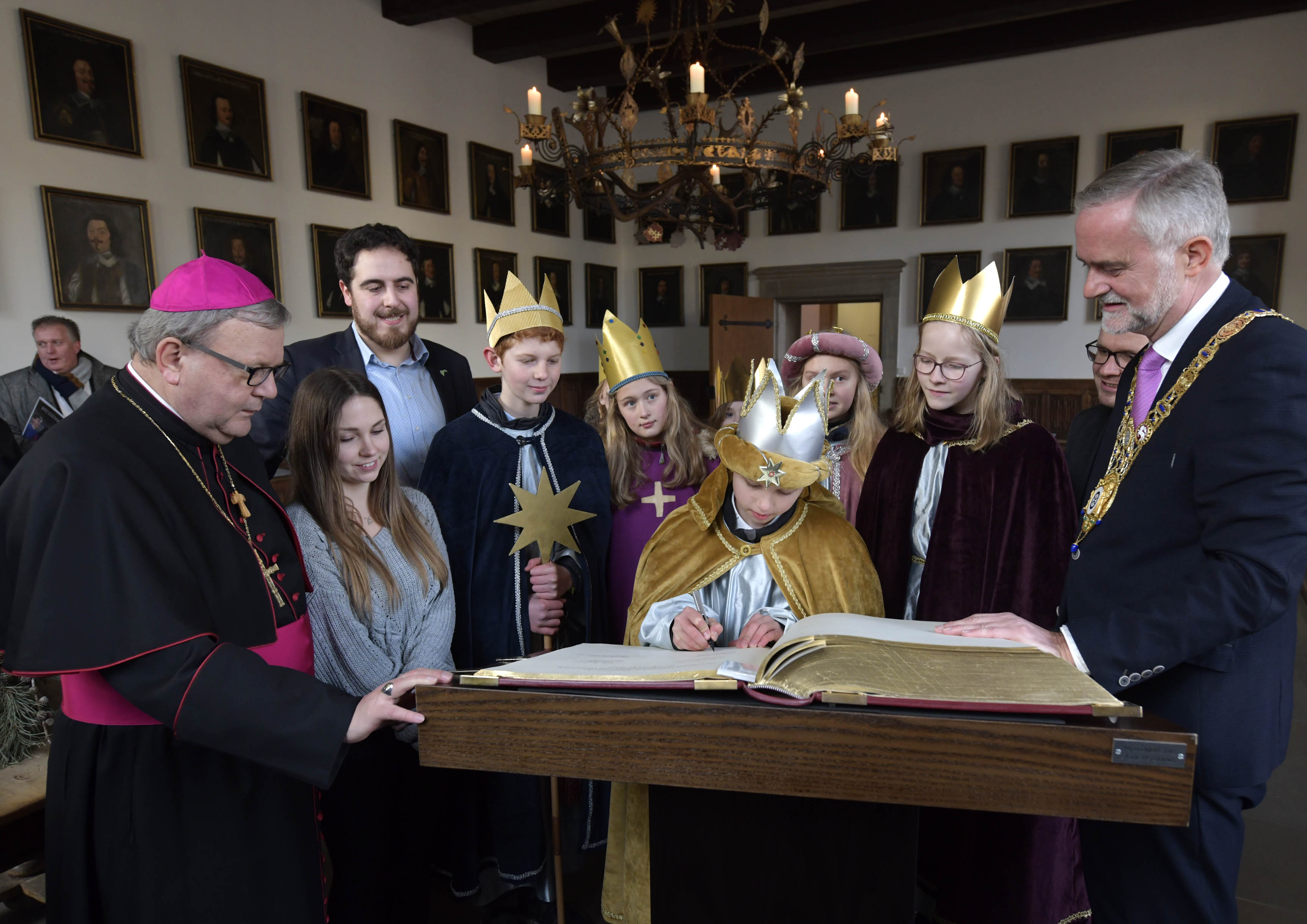Vier Sternsinger aus der Pfarrei St. Johannes in Spelle haben sich heute ins Goldene Buch der Stadt Osnabrück eingetragen. Hintergrund war der bundesweite Auftakt der Sternsinger-Aktion in Osnabrück. Rund 2.000 als Königinnen und Könige verkleidete Kinder und Jugendliche nahmen bei der Veranstaltung im Osnabrücker Dom teil. Die vier 12 bis 14 Jahre alten Sternsinger aus Spelle standen dabei stellvertretend für alle Sternsinger, die in den nächsten Tagen von Haus zu Haus ziehen, um den Gebäuden den göttlichen Segen zu geben. Das Geld aus der diesjährigen Sternsinger-Aktion soll für Friedensprojekte im Libanon eingesetzt werden.