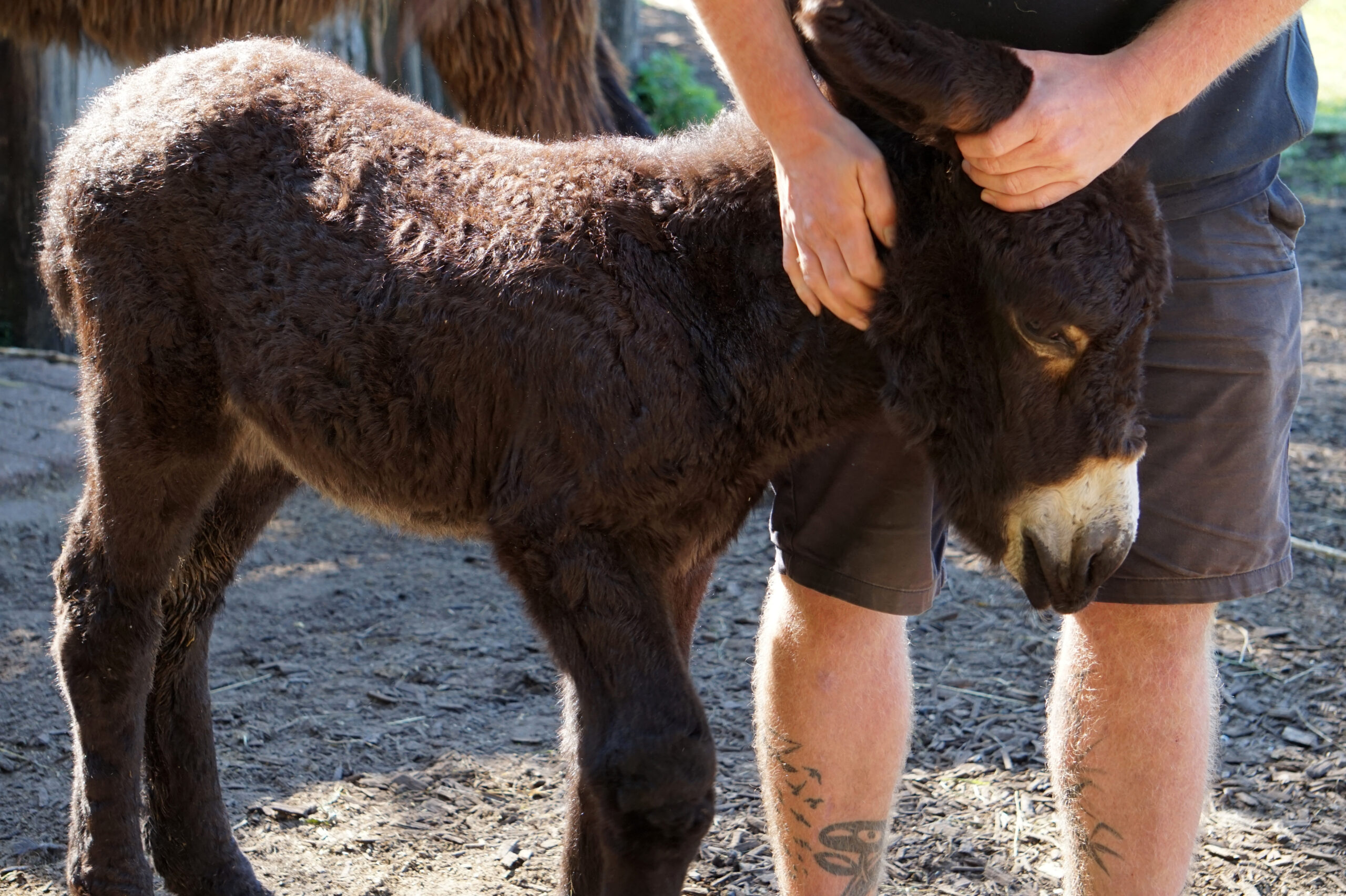 Genau einen Monat ist „Kacie“ heute alt. Am 4. August erblickte das Eselfohlen das Licht der Welt. „Kacie“ ist ein kleiner Poitou-Esel – und ‚klein‘ ist hier genau das richtige Wort. Die ausgewachsenen Poitou-Esel lassen allein durch ihren Anblick keinen Zweifel daran, dass diese Eselrasse zu den größten der Welt zählt. Um „Kacie“ zu streicheln oder hinter den langen Ohren zu kraulen, muss man sich aber noch ein wenig hinabbeugen. Und das passiert recht oft. „Kacie“ geht voll auf Kuschelkurs und widerstehen kann ihr wohl kaum jemand. Auch Reporterin Wiebke Pollmann nicht. Sie hat „Kacie“ im Tierpark Nordhorn besucht.